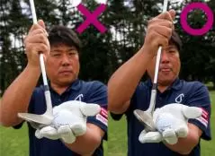 小祝さくらはあまり器用なタイプではなかったので、小手先のテクニックはそんなに教えてきませんでした。しかしラフから打つときの構え方はラウンドしながら教えました。ラフを攻略するポイントは芝の抵抗をなるべく少なくすること。そのためには、フェースを少し被せて(トゥ側を前に出す)、ロフトを少し立てる構えを作ること。その構えで打つと、ソールのトゥ側しか芝に当たらないので普通のアドレスに比べて格段に抜けが良くなります。