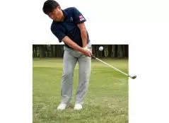 そして最後のポイントになるのが左足です。アプローチはアドレスからフォローまで左ヒザに体重がかかっていることで軸がブレずに、滑らかなダウンブロー軌道になります。そして、左足を動かないように左腰を回転できるようになるとスムーズに上半身が回るようになるので、体で打つアプローチになります。