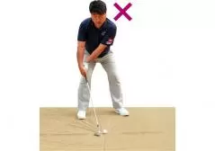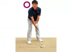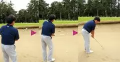 もう1つ勘違いしやすいのがハンドレイトの構えです。ハンドレイトに構えようとすると手首を後ろにしようとする人が多いですが、バンカーではヘッドを少し前に出すのが正しいハンドレイトです。