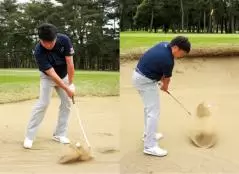 アマチュアの皆さんが最もアプローチで勘違いしているのがバンカーショットだと思います。まず、バンカーショットはアウトサイド・インで打つ必要はありません。目標方向に対してスタンスをオープンにするだけで、スタンスに対しての軌道はストレートです。オープンスタンスでストレート軌道だとボールが左に飛ぶと思うかもしれませんが、フェースを開いているので、ボールはフェースが向いている方向に飛び出します。