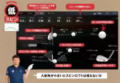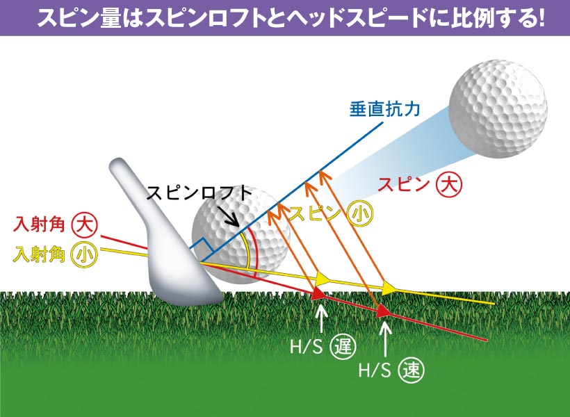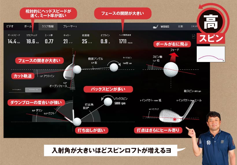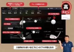 「ダイナミックロフト(インパクト時のロフト角)はほぼ同じですが、スピンを効かせるときはアタックアングル(入射角)がより鋭角で、その結果スピンロフトが約4度大きくなっています」(佐々木さん)