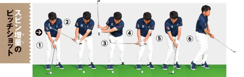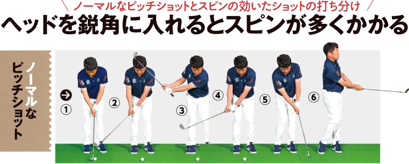 \ノーマルなピッチショットとスピンの効いたショットの打ち分け/ ヘッドを鋭角に入れるとスピンが多くかかる
