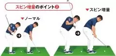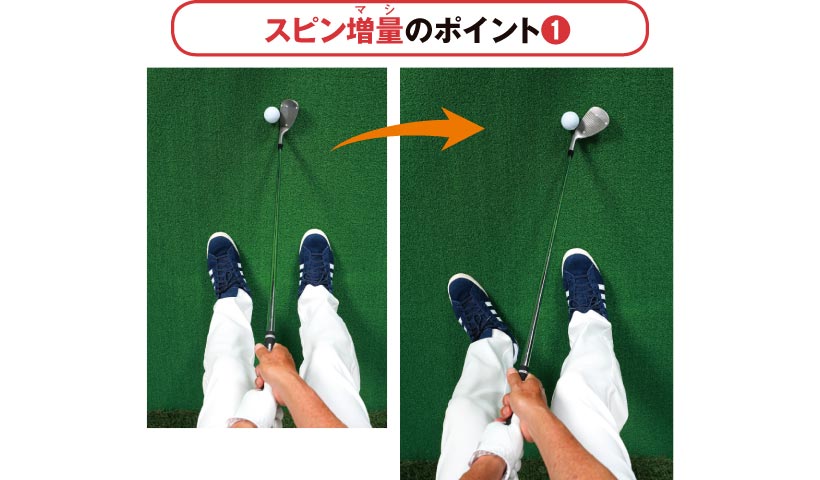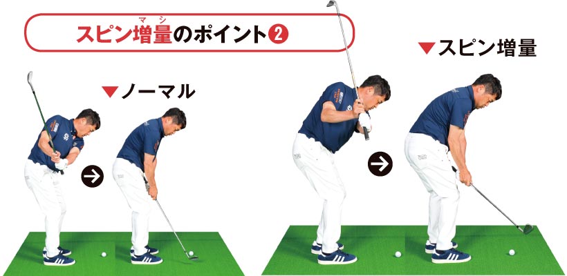 スピンを増やすいちばんやさしい方法はダウンブローでアタックアングルを深くしてスピンロフトを増やすこと。簡単にマネできる打ち方をヨコシンに教えてもらった。