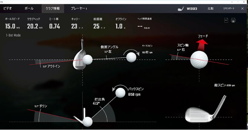 スピンのかけ方を教えてもらう前に、ノーマルなピッチショットとスピンを効かせたピッチショットの2通りのショットを横田真一に打ってもらい、弾道測定器「GCクワッド」を使って比較してみた。