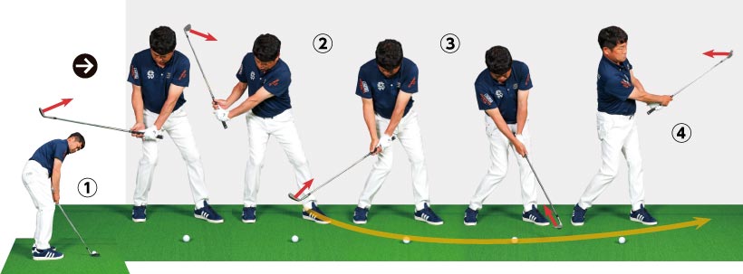 ⑤ヘッドを真っすぐに動かして球をフェースに乗せる。