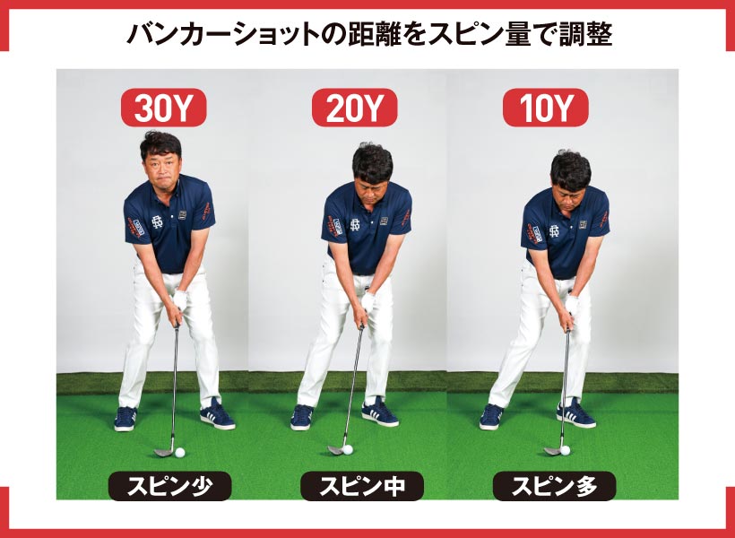 バンカーショットでスピンをかけたいときは、ボールの奥側の砂をとるようにします。ボールとフェースの間に入る砂が少なくなり、接触面積が大きくなるのでスピンが増えます。奥の砂をとるにはボールを左に置き、左足体重で構えてクラブを上から入れるのがコツです。