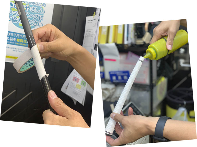 最も簡単に自宅でできる作業の1つがグリップ交換です。作業工程としてはグリップカッターなどを使ってグリップを外すところからスタートしますが、家庭用のカッターでも代用できます。グリップを外したら、テープが貼ってあったところを拭きますが、このときにコロナ対策で買ったアルコールなども有効活用してください。テープがはがしにくいときは、ドライヤーが使えます。その後、シャフトに下巻きテープを巻いていきますが、オススメはニットウ(日東電工)の両面テープ。多くのゴルフ工房や中古ショップでもニットウを使っています。その理由は、長く使った後でもはがれやすいので、圧倒的に扱いやすいこと。もちろん接着力も問題ありません。