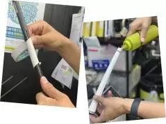 次はいよいよ新しいグリップに溶剤を入れる過程です。クラフトマンの中にはスプレー用の溶剤を使う人もいますが、スプレーは慣れていないと使いにくい。だから、自宅ではじめてやる人はホワイトガソリンを使ってください。ホワイトガソリンはアウトドア用のランタンなどに使われてもので、コールマン製がベスト。プロトーナメントのツアーバンでもホワイトガソリンを使っているメーカーは多いです。その理由は乾燥時間が短いので、翌日のプレーに間に合うからです。