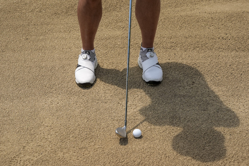 とはいえ、ダフって打つ=エクスプロージョンショットが打てさえすれば、ボール位置を気にする必要はありません。スタンス中央に置いても、右足寄りに置いても、問題はありません。