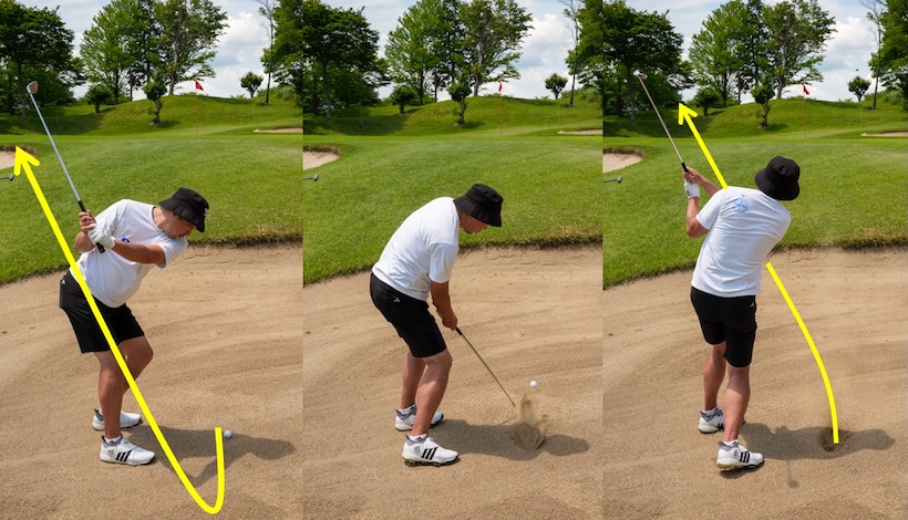 砂ごと打つ主な理由は、ボールと砂を一緒に打ったほうが簡単にボールが上がり、バンカーから脱出できるからです。