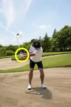 こういったミスを防ぐためには、バックスイングでしっかりコックを使ってヘッドを上空まで上げることが大切。ヘッドが上がれば、それだけ砂を飛ばすエネルギーが大きくなります。また「打って、終わり」ではなく、しっかり振り抜くことも非常に大切です。