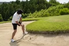 アゴが高くて、砂が薄いバンカーに入ってしまうことが稀にあります。この状況は技術レベルが高い人でも難しいものです。