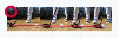 クラブヘッドを胸の高さに保ち地面と平行に振る“平行素振り”をすれば、低く長いヘッド軌道の感覚が身につきます。