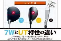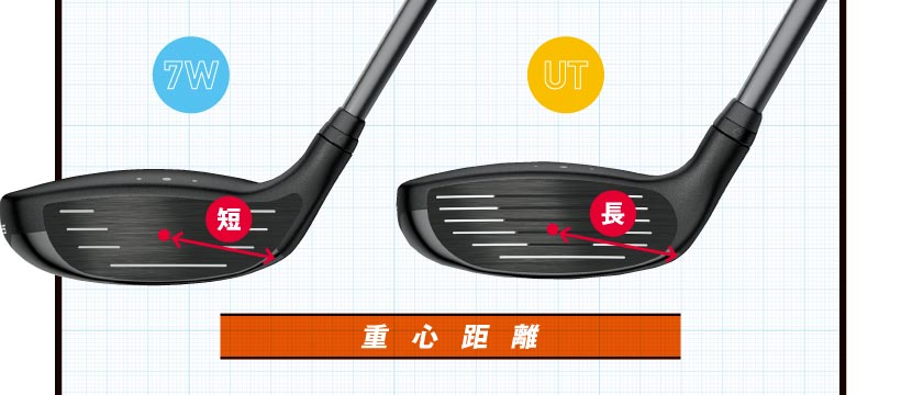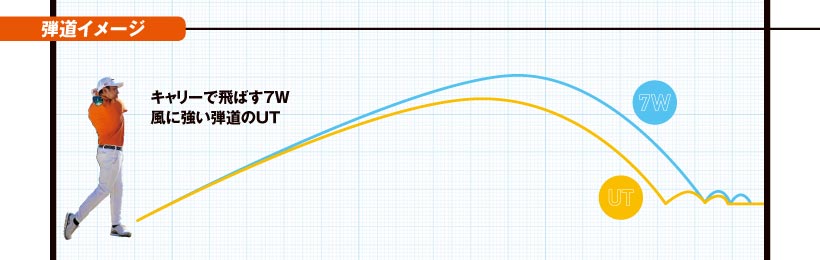 ロフト角は同じでも7Wは、より重心深度が深くなるため、インパクトロフトが増加しやすく、低重心でもフェース面上のスイートスポットは高くなるため、打ち出し角は高く、バックスピンもかかりやすい。7Wは高弾道でキャリーが出てランは少ない。UTは風に強い中弾道で適度にランが出る球筋になる。