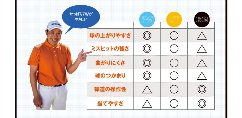 ヘッドの特性とその機能を比較すると、7Wのやさしさがよくわかる。曲がりにくいのだから“球を曲げる”操作性の評価は低くなるが、5番アイアンの上の距離を打つのであれば、多くのゴルファーは操作性を必要としないはず。むしろ、やさしさで選べば圧倒的に7Wに軍配が上がる。唯一の弱点は“長さ”が長いことによる“当てにくさ”と言えそうだ。