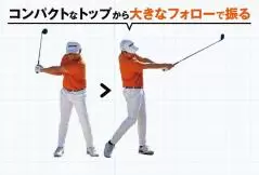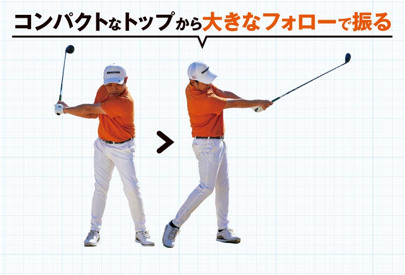 5番アイアンでは届かない距離を打つので、飛ばそうとする意識が強いとクラブを思い切り振り上げたくなりますが、これが曲者。トップの位置が高くなれば入射角も急になりやすい。コンパクトなトップから大きなフォローを意識すれば自然と入射角が浅くなり、ミート率も上がります。