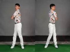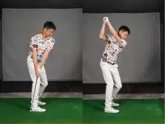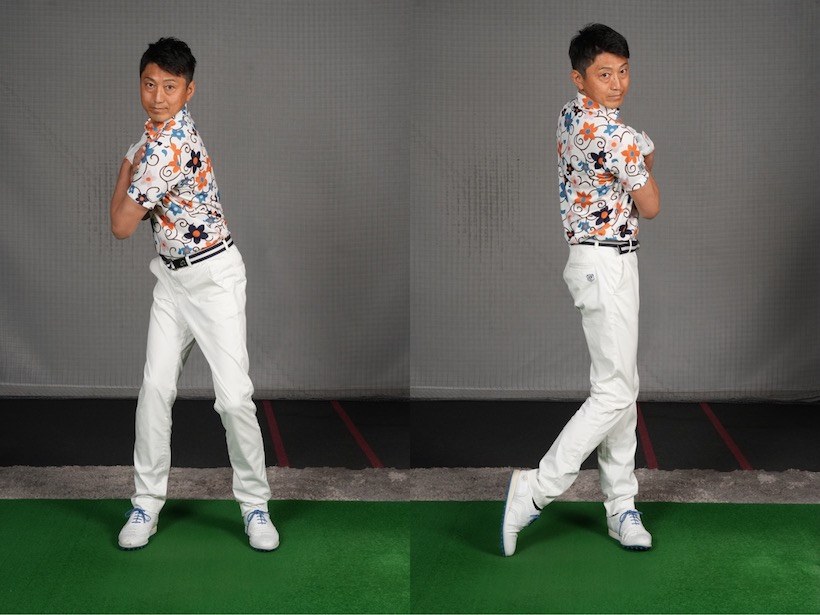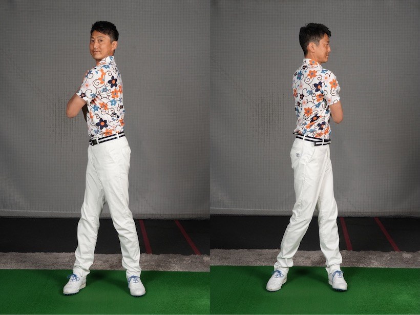 ここで大事なのは腰からヨコ回転させること。腰を止め、肩を回して上体を捻るのではなく体幹をヨコ回転させます。腰やお腹、骨盤など自分が意識しやすい部分を回せばOK。左のお尻からスイングを始動するといいでしょう。