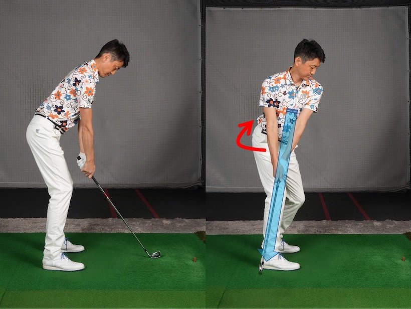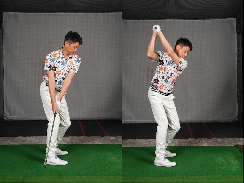 ヨコの動きは体を右→左へと回転させる動き。真っすぐ立ってヨコ回転すると肩が地面と平行に動きますが、これが基本となるヨコ回転。すングする場合、アドレスで前傾姿勢をとりますから、ヨコ回転すると左右の肩に多少の高低差ができる。バックススイングでは左肩、フォローでは右肩がやや下にきます。