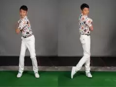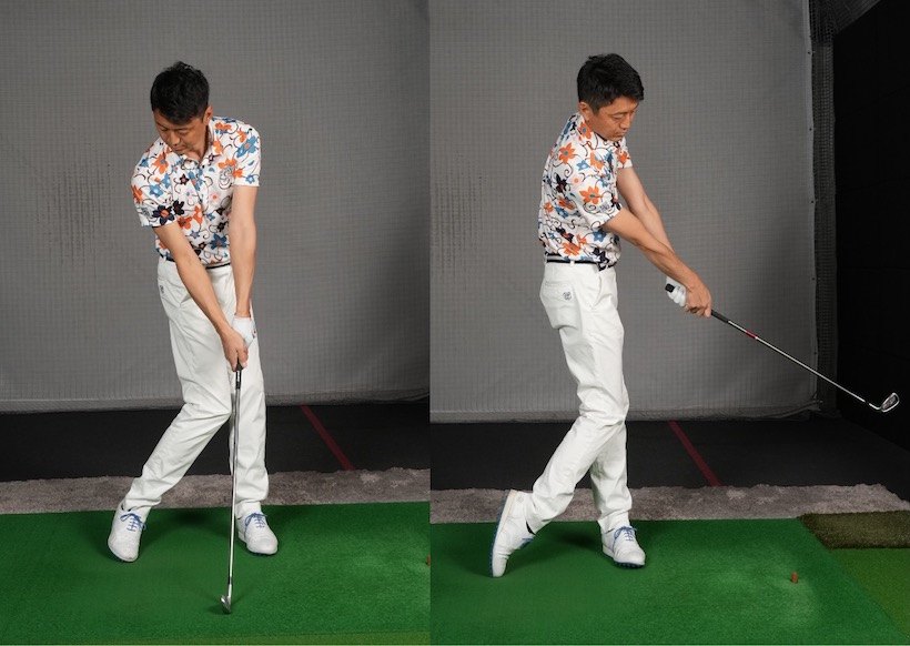 また、実際のスイングではバックスイング側への右回転がゆっくりめなのに対し、切り返し以降の左への回転速度が速くなります。左に回転するのに伴い、右ヒザが左ヒザについて右カカトが上がります。