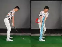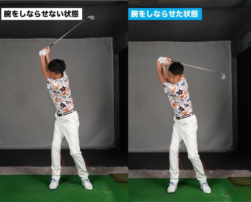 ヨコ回転で体幹が右を向く動きがバックスイングですが、そのままではクラブが上がらないので、腕を上方向に動かしてクラブを上げます。