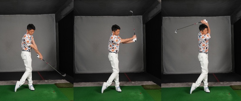 ダウンスイングではこれと逆に動きます。腕を使ってクラブを下方向に振れせば、体幹のヨコ回転と融合してクラブヘッドがボールに向かいます。