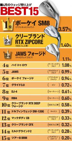 ウェッジにおいてはタイトリスト、クリーブランド、キャロウェイ、テーラーメイド、ピンなどの、いわゆる『外ブラ』が席巻しているという人気の構図に大きな変化は生じていない。今回もタイトリストの『ボーケイSM8』が不動の位をキープしている。PGAツアーにおける圧倒的な使用率が、消費者への信頼につながっているのだろう。