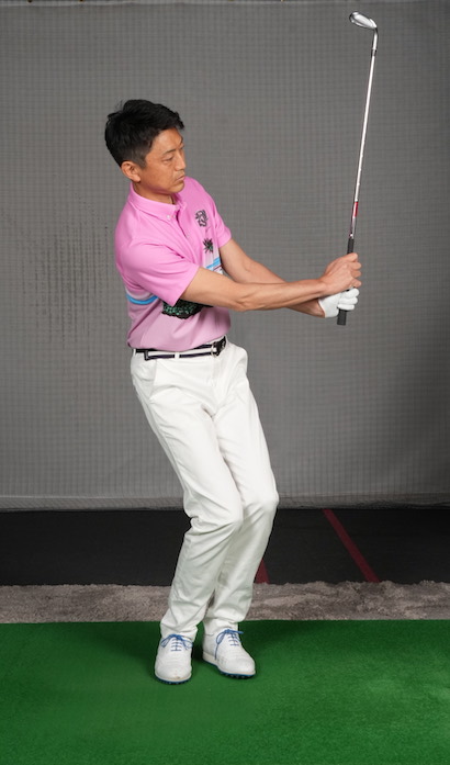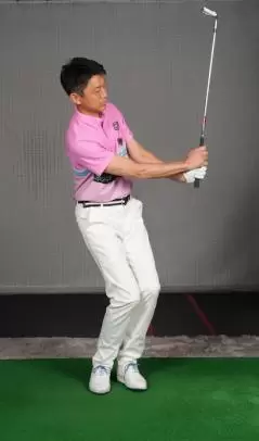 AWとSWはともにこの打ち方。振り幅の大きさで距離をコントロールします。