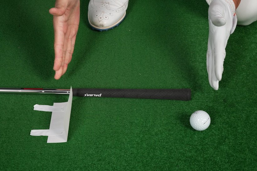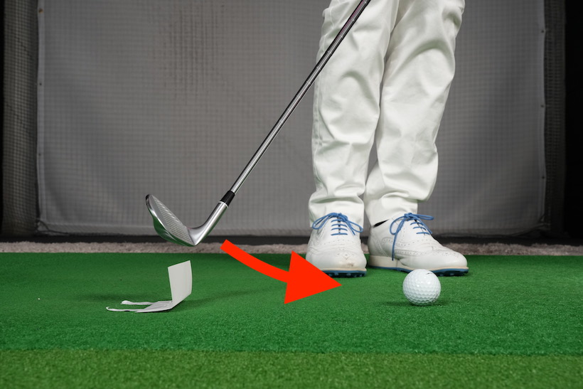 できたらボールを打つだけ。テークバック時にはヘッドがメモ用紙に触れても構いませんが、ダウンスイング時に当たってはいけません。当たったら入射角が低すぎ。上から入れば当たりません。