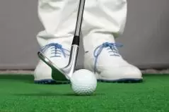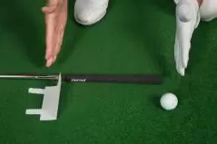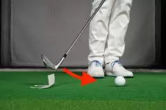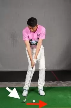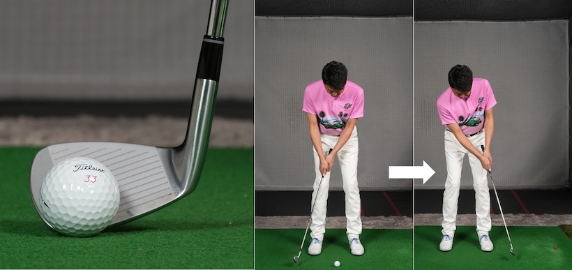 パットのようにボールの近くに立つには、クラブを吊るようにして少し短く持ちます。こうするとヘッドのヒールが浮いてトゥ側が地面に接しますがそれでOK。トゥ側にセットしたボールをパットの要領で打つだけです。