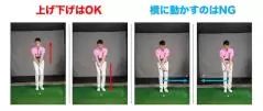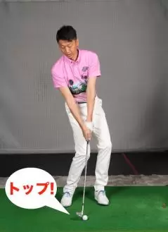 コックとは手首を親指側に折る動き。体を左に回しながらコックしてクラブヘッドを上げたら、アドレスの位置に戻りながらコックを解きます(リリース)。こうすればボールに向かって上からヘッドが入ります。打ったあとはそのままヘッドを低く保ちます。再びコック(リコック)してヘッドを上げる動きは不要。「コック→リリース→ノーリコック」で、ヘッドを「上げる→下げる→下げっぱなし」という動きに導きましょう。