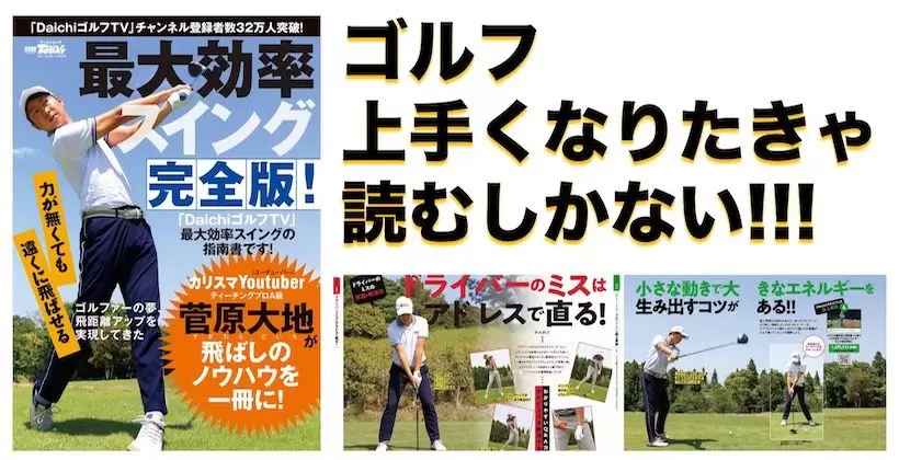 あの! わかりやすくて面白い、上達の参考になる「DaichiゴルフTV」を誌上に完全再現しました。いつでもどこでも「DaichiゴルフTV」を“読める” 。菅原大地の飛ばしのノウハウが集約された「最大効率スイング完全版!」、ぜひ書店等でお買い求めください!