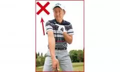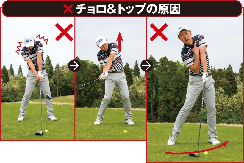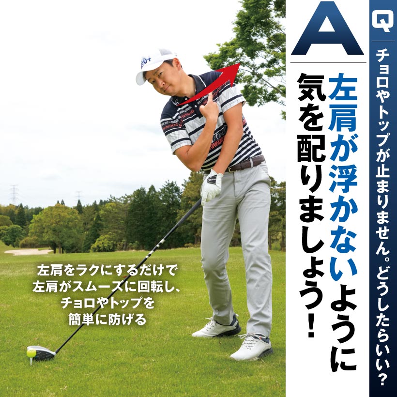 クラブヘッドがボールの上っ面に当たると、ボールが低く飛び出すトップ。辛うじてボールにかすった場合はボールが数ヤードコロがるだけのチョロが生じます。トップの悪化版がチョロで、最悪は空振りとなりますが、下からあおり系のスイングになっているという点では共通です。どうしてそうなるかというとインパクトで左肩が浮き上がってしまうためですが、そもそもアドレスで左肩が硬直しているところに問題点があるのです。
