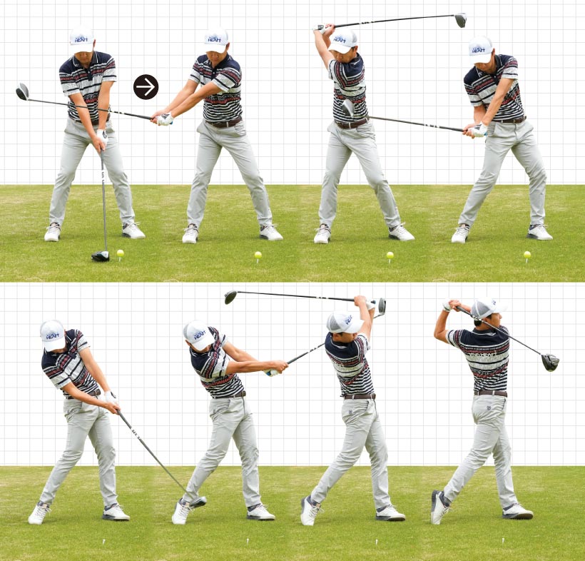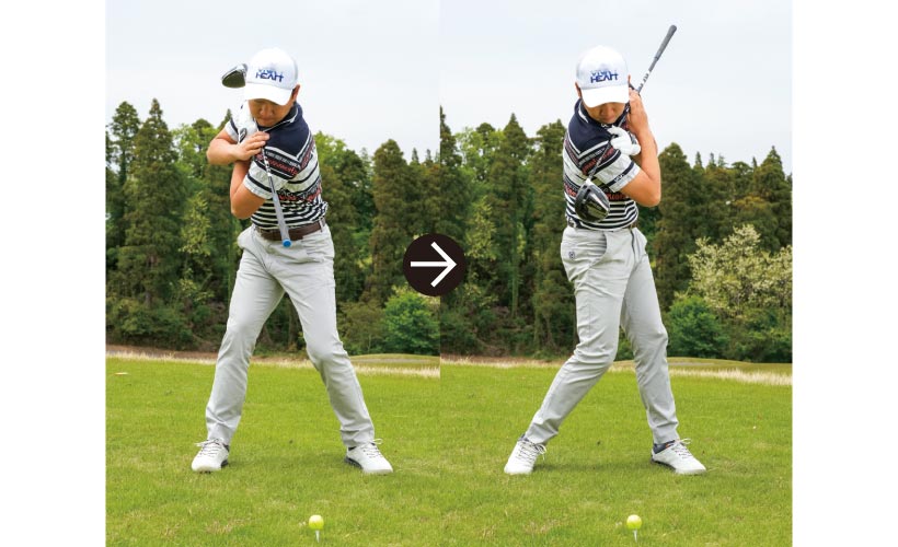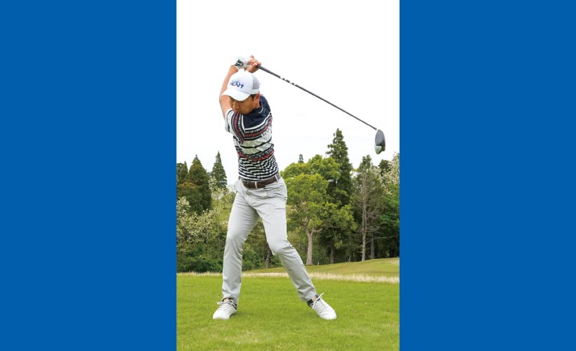 大事なのは思い切り振り抜いた反動でクラブを胸の前にすっと戻してくること。ラクなスイングでは絶対に飛距離アップしません。普段の練習でもドライバーで打つときはコースと同様発に絞り、球ごとに魂を込めて打つように習慣づけてください。