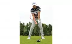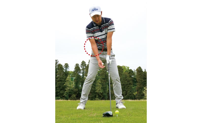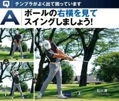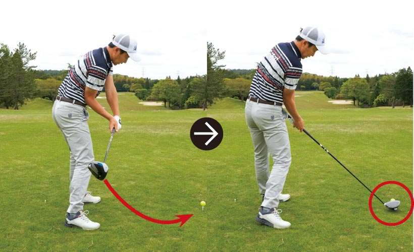 解決法としては突っ込み打ちを直すことですが、まずアドレスを修正しましょう。ドライバーショットの場合、ボールを左カカト内側の延長線上にセットするのが基本ですから、ボールを上から見ないでカラダの軸を少し右に傾けて、ティアップしたボールの右横を見るつもりで構えるのが正解です。あとはアドレスの目線をスイング中もキープするだけで構いません。石川遼選手のように頭をしっかり残して、適正のアッパー軌道でボールをとらえることができ、テンプラが一発で直りますよ。