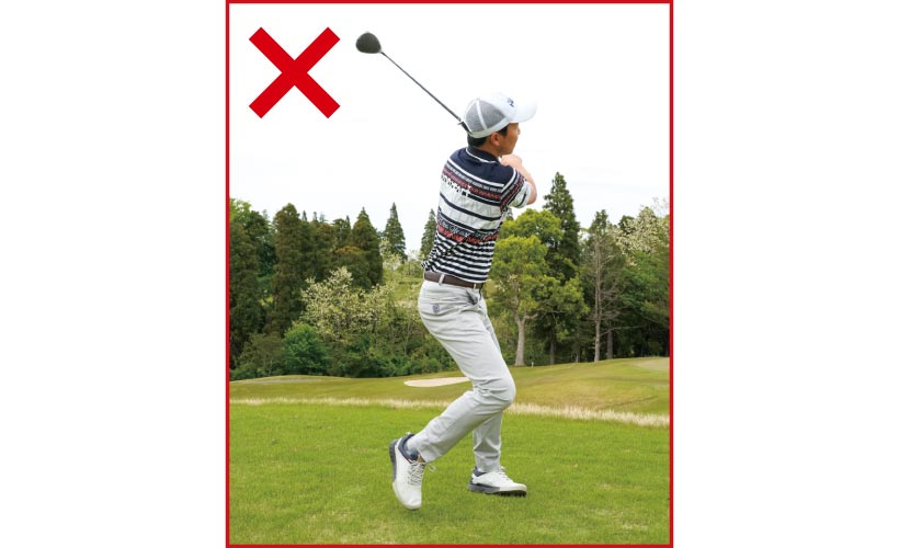 思いきり振り抜いた反動で、クラブが勝手に胸の前に戻ってくるくらいのマックススピードで振ろう。
