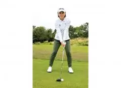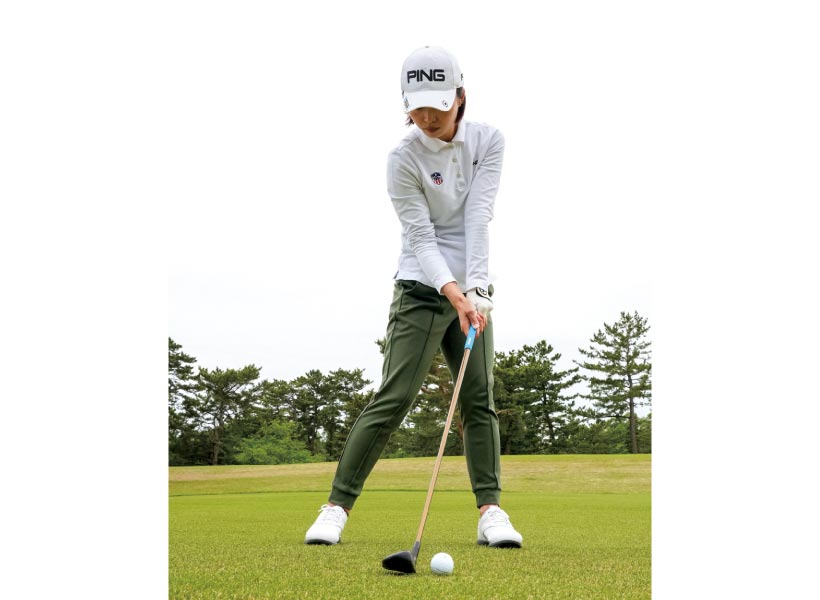 右に飛びやすいライなので目標の左を向いて構えます。そのまま設定目標に向かって振れば軽いフェードで目標方向に飛びますが、多くの人は本来の目標に向かって振ってしまう。これが右に飛ぶ原因です。クラブを短く持ち、設定した目標に向かってコンパクトに振りましょう。