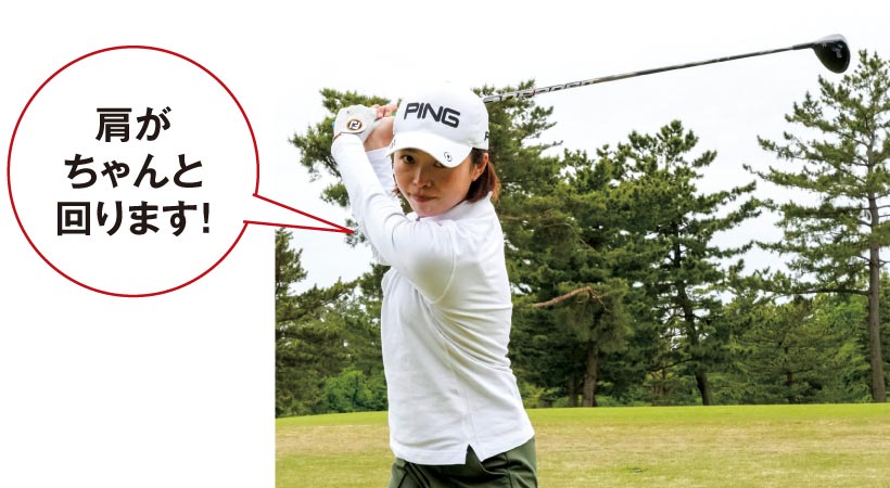 解決するにはバックスイングでしっかりカラダを回す。テークバックで数十センチ、ヘッドを真っすぐ引く意識をもつと、カラダが一緒にターンしていく。そのままバックスイングすれば肩が回って深いトップになります。