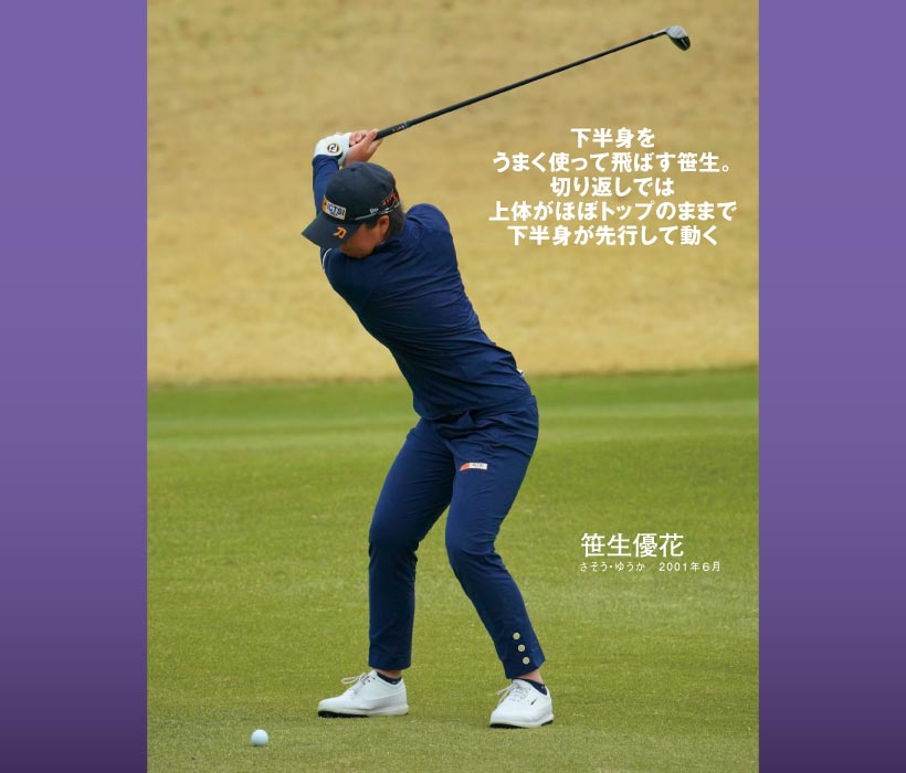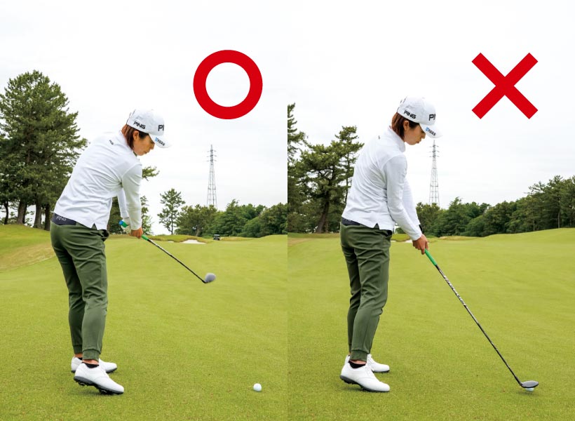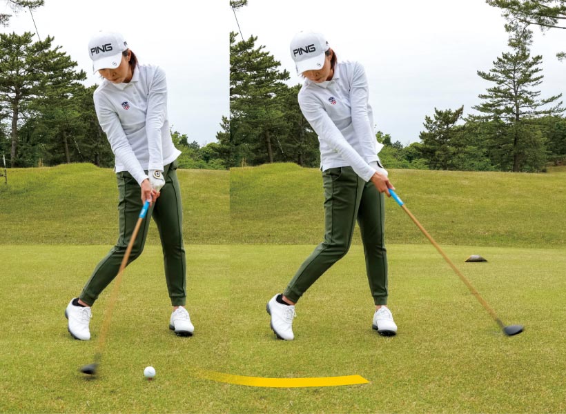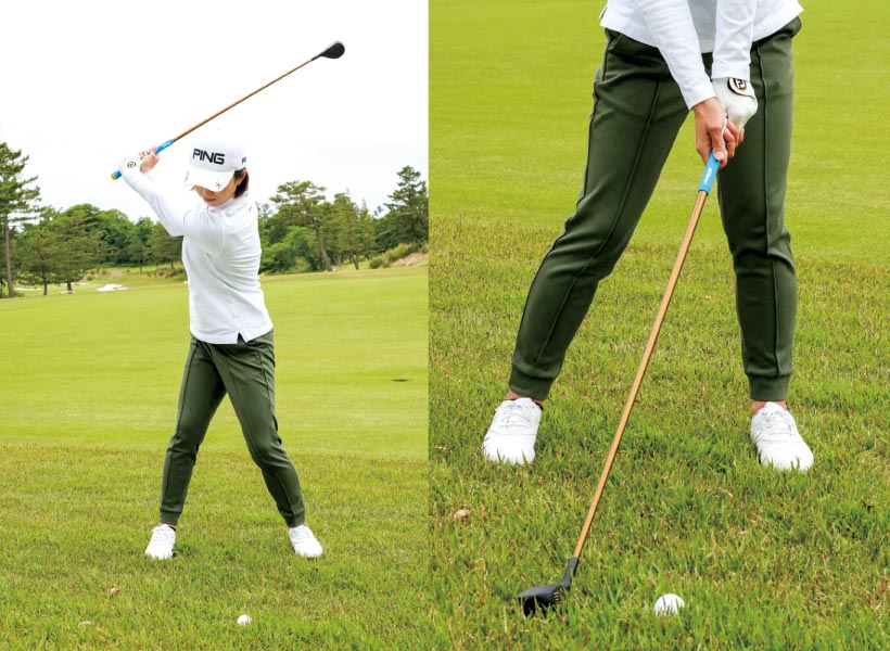 カラダを回しきるには下半身から切り返すことです。手や上体の主導でクラブが下りないため入射角が緩やかになり、ソールの広さが生きてインパクト前後でヘッドを低く動かせます。スムーズに振り抜けるようになって本来の球筋になり飛距離が出ます。