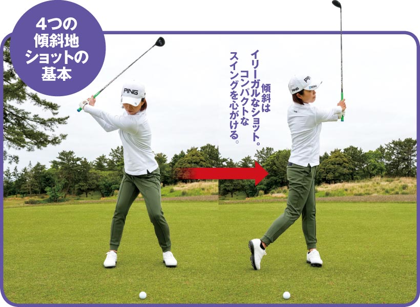 まずクラブを短く持ちます。ボールの位置が高い分、ボールに近づいてアドレスしましょう。左に飛びやすいライですが、右を向きすぎるとプッシュアウトするので傾斜が緩やかならスクエアでOK。スイング軌道は傾斜なりにイン・トゥ・インを意識すること。コンパクトに振ればヒッカケません。