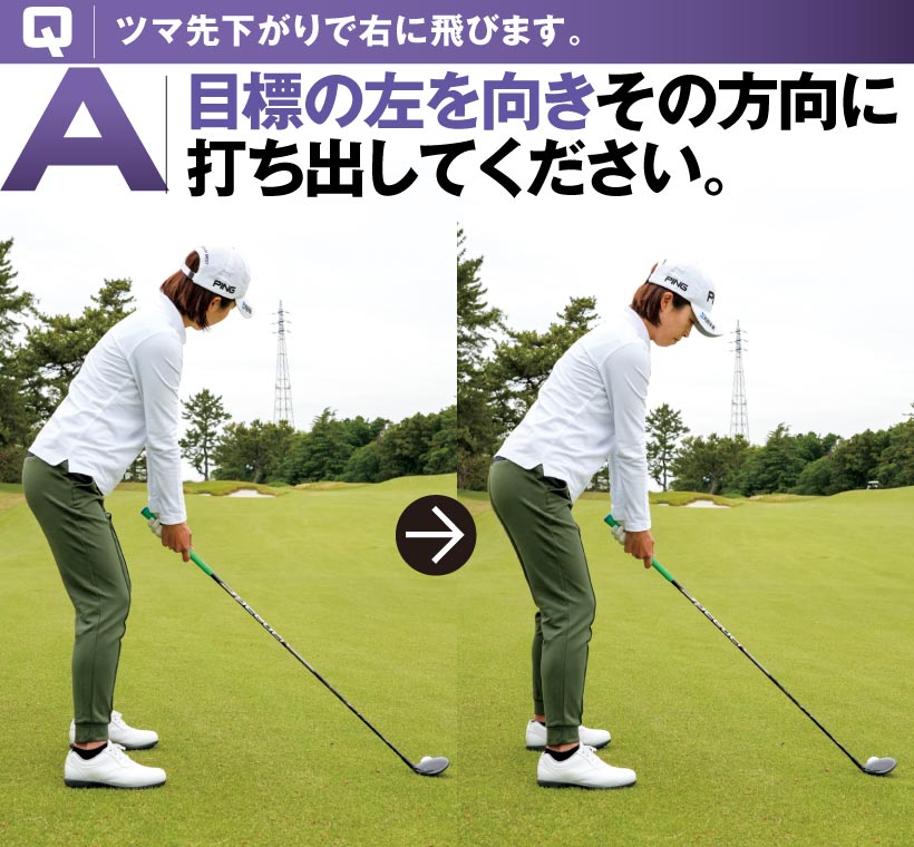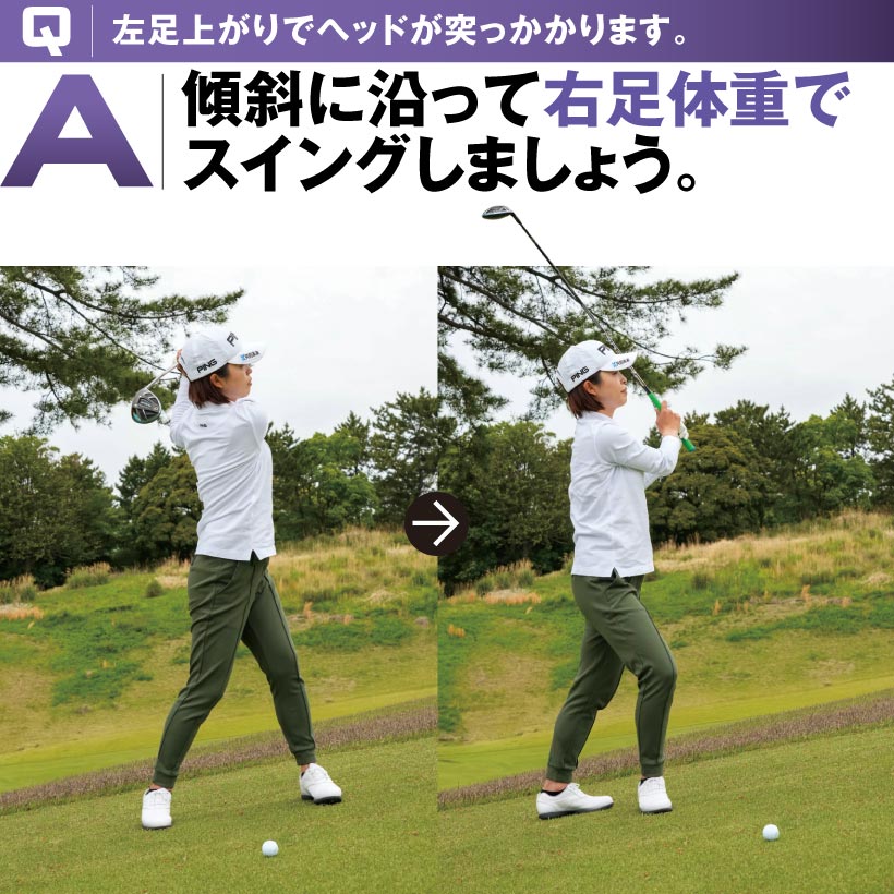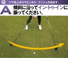 Q|ツマ先上がりでヒッカケ、プッシュが出ます。