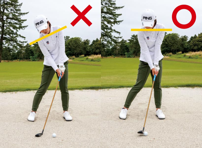 トップもダフりも出る人は、まずアドレス時の目線をチェックしてみてください。地面と平行にすることを目安に、できるだけフラットにしましょう。