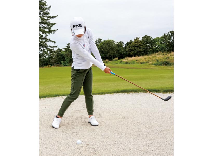また、強振すると抵抗が増しますから、力が抜けない程度の力感で、ボールの手前からソールを滑らすようにするとスムーズに振り抜けます。いずれにしても手前からコロがして目標に近づける戦法をとってください。