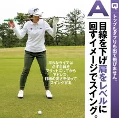 ただ、ボールを上げようとすると右肩が下がってダフるので、肩をレベルに回すイメージをもってください。フォローで打ち出す感じをもつとレベルに回りやすくなります。