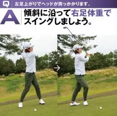 A|傾斜に沿って右足体重でスイングしましょう。