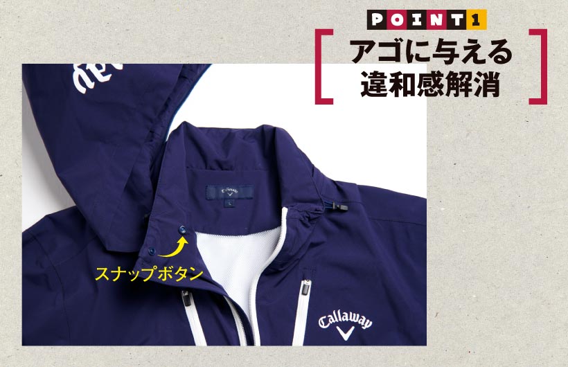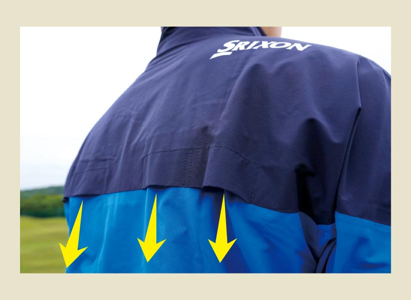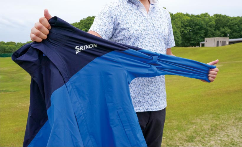 スイングのしやすさを追求した素材とデザイン。縫製部分の裏側にはシームテープを貼り、襟ぐりはスピンドル設計で、首元からの雨を入りにくくしている。袖は取り外し可能。