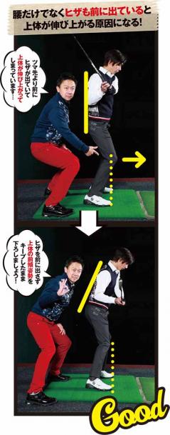 写真 右)腰の角度は変えないままクラブだけ落とせば球は自然と上がります!