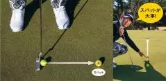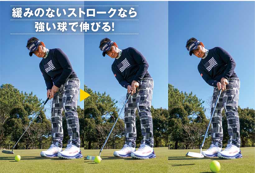 緩みを防ぐには、インパクト後まで頭を残すことが第一。特にショートパットは結果が気になり、頭が左(カップ方向)に流れやすいので、打った後もボールがあった位置を見続けるつもりでストロークします。頭をしっかり残せば、芯でヒットしやすく、ヘッドアップのミスも防止できます。