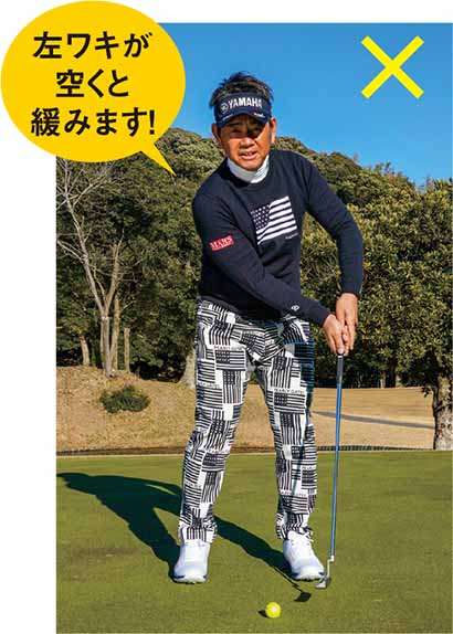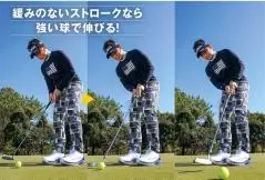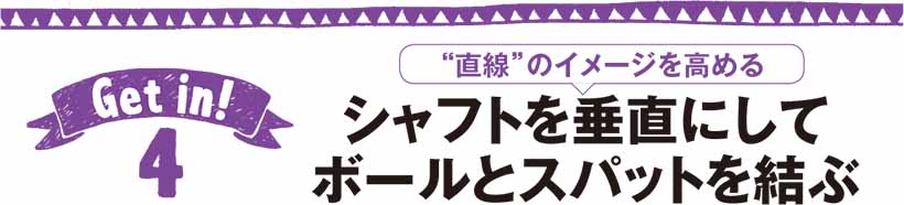 第二のポイントとして、具体的な体の部位を意識しましょう。体が起きる、左ワキが甘くなる、肩が開くといった症状が緩みの原因なので、背骨の前傾角を保つ、左ワキを締める、肩のスクエアなラインを保つといった意識が大切。どれか一つを意識すれば、全体が連動してよくなるため、緩みのないストロークが実現します。