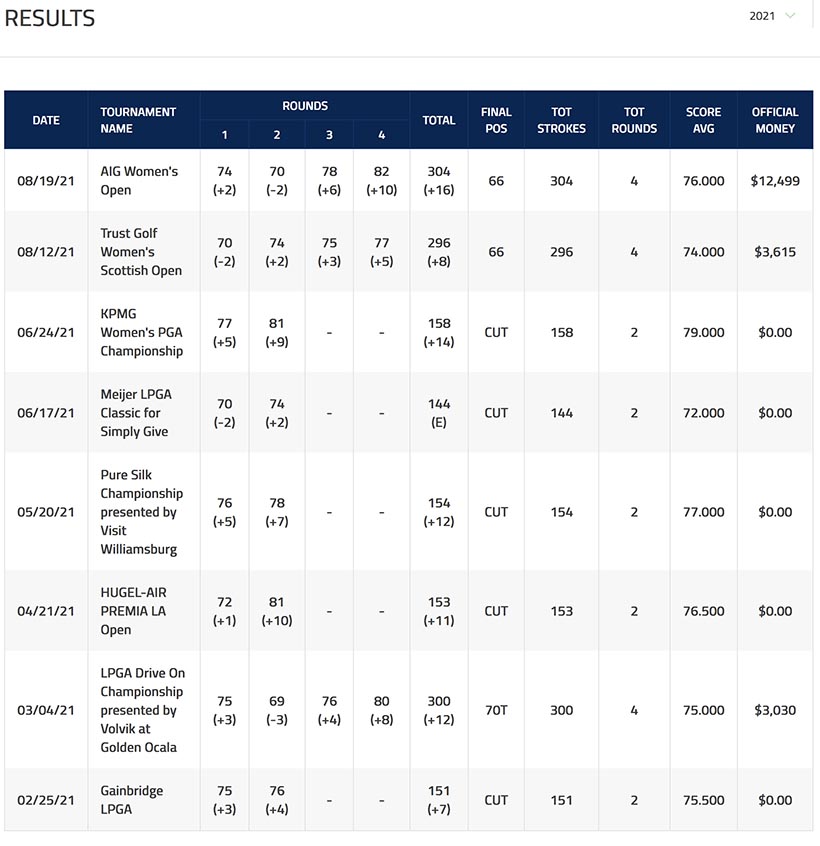 決勝ラウンドでは大きく崩れて最下位の66位に終わったが57歳319日での予選通過は称賛に値する。4日間の平均飛距離は267.0ヤード。これは優勝したアンナ・ノルドクビストの258.0ヤードを大きく上回っている。決勝ラウンドに進んだ日本勢4人の中でデービースより平均飛距離が上だったのは畑岡奈紗(270.0ヤード)だけ。パワフルさは健在だ。