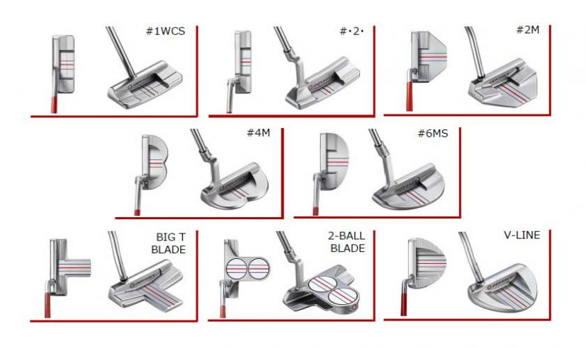 ヘッドタイプには、幅の広いブレードをセンターシャフト仕様にした「#1WCS」、ブレードタイプの「#・2・」、6角形の「#2M」、アルファベットのBのような形状の「#4M」、小ぶりなマレットにスラントネックを持つ「#6MS」、アルファベットのT型をした「BIG T BLADE」、大きめのマレットタイプである「V-LINE」、そして2-BALLとブレードを融合させた「2-BALL BLADE」をラインナップ。全てのモデルに赤いNEW STROKE LABシャフトを装着。また、追加ラインナップのすべてのモデルに赤と青の3本線、トリプル・トラックアライメントが入れられており、目標に対しての構えやすさが向上している。